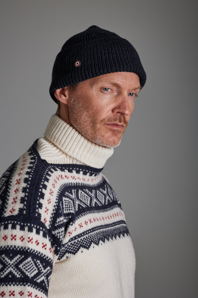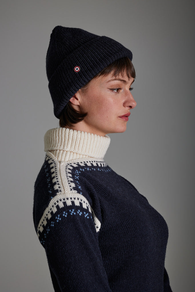 På en kald dag er denne ull luen et perfekt supplement til strikkeplaggene våre. Ribbestrikk i samme garnkvalitet og fargepalett som våre gensere.