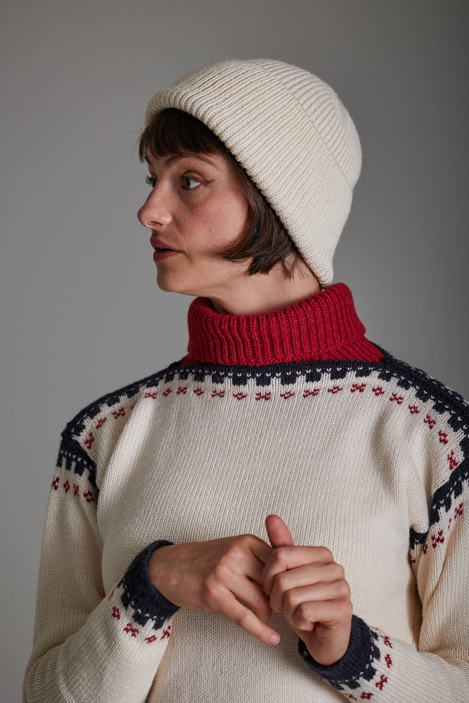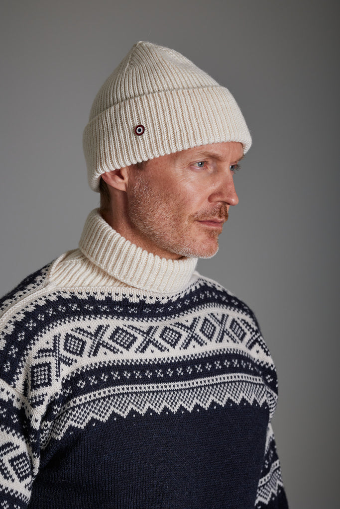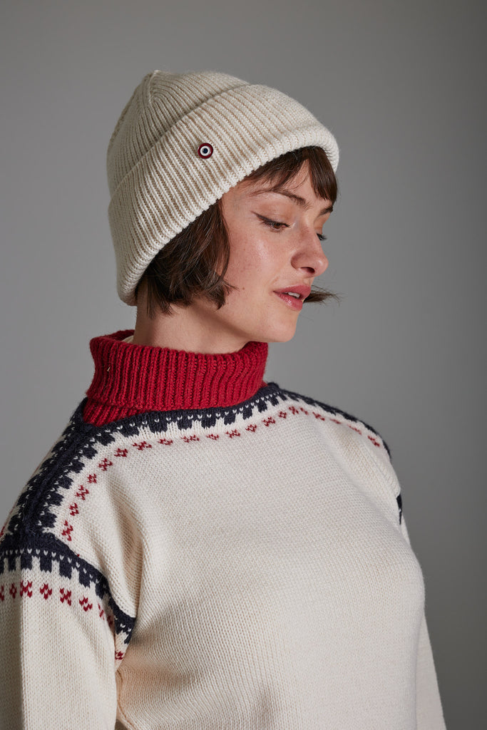 På en kald dag er denne ull luen et perfekt supplement til strikkeplaggene våre. Ribbestrikk i samme garnkvalitet og fargepalett som våre gensere.