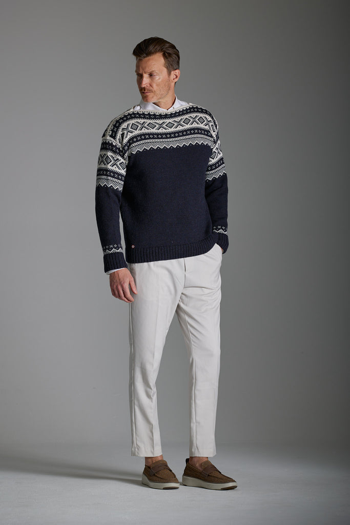 Stein Eriksen var kjent for sin elegante stil, alltid antrukket i sin mors strikkedesign. For å hedre Stein sin store innsats som frontfigur for Bitten Eriksens mest populære genser, ser vi frem til å presentere denne klassikeren under navnet «Stein».
